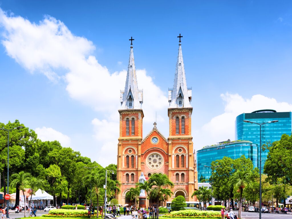 Begin your journey at Notre Dame Cathedral, an impressive red-brick church with twin spires, built using materials imported entirely from France.