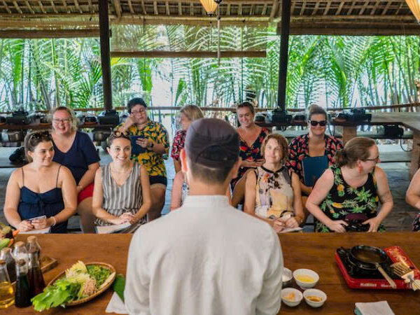 The Red Bridge Cooking School is one of the highlights of the culinary scene in Hoi An. Meet up with your chef and other guests at Hai Café in the Ancient Town for a brief introduction. Take a leisurely walk through Hoi An’s colorful central market with your chef and learn how to select fresh produce and essential ingredients used in Vietnamese cuisine. We board a boat for a leisurely cruise (25 minutes) along the Hoi An River to the Red Bridge Cooking School. It is a great opportunity to observe local river life.