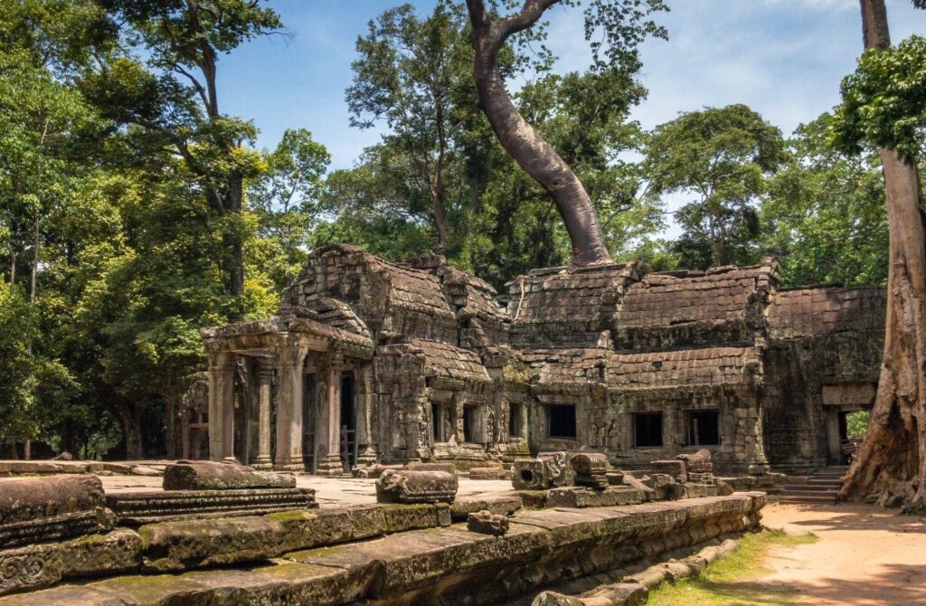 Continue to Ta Prohm, which is considered to be the most photographed temple within the Angkor complex. Constructed in the Bayon style between the late 12th and early 13th century, Ta Prohm was left pretty much untouched by archaeologists. The trees that grow out of the ruins allow for a mysterious feeling filled with photogenic opportunities. King Jayavarman VII constructed the temple as a Mahayana Buddhist monastery and university, and it is estimated that close to 80.000 people resided at the temple.