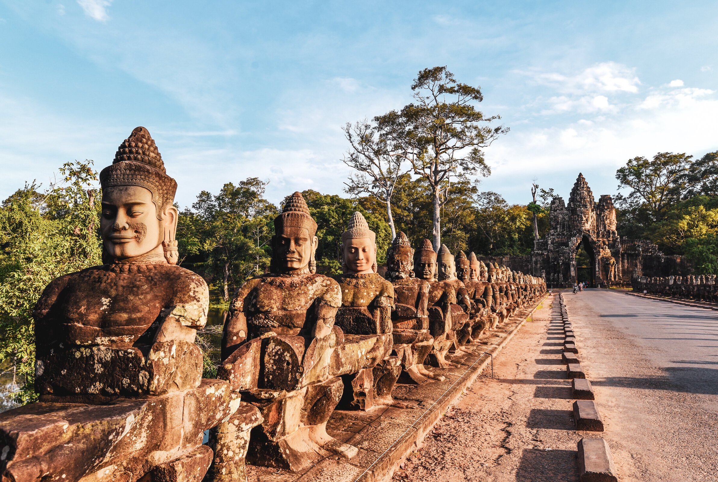 Visit the former capital of the Angkor Kingdom, Angkor Thom, which translates to“Great City”.The city covers an area of 9km² in which numerous breath-taking monuments were built. The centrepiece of the city is the Bayon. Its most distinctive features are the 216 serene stone faces that seemingly face all directions. The Baphuon and Phimeanakas are structures built in the 11th and 10th century respectively and both were built in the pyramid style. The Terrace of the Elephantsis a 300 meters long terrace that has three main platforms and two subsidiary ones. The south stairway is framed with three-head elephants gathering lotus flowers with their trunks. The central stairway is decorated by lions and garudas in bas-reliefs in a stance of support for the stairways. One of the main attractions of this terrace is the facade decorated with elephants and their riders depicted in profile. Likewise, the Terrace of Leper Kingwas constructed in the 12th century.The curious name of this terrace refers to a statue of the Leper King that is on the platform of the terrace.