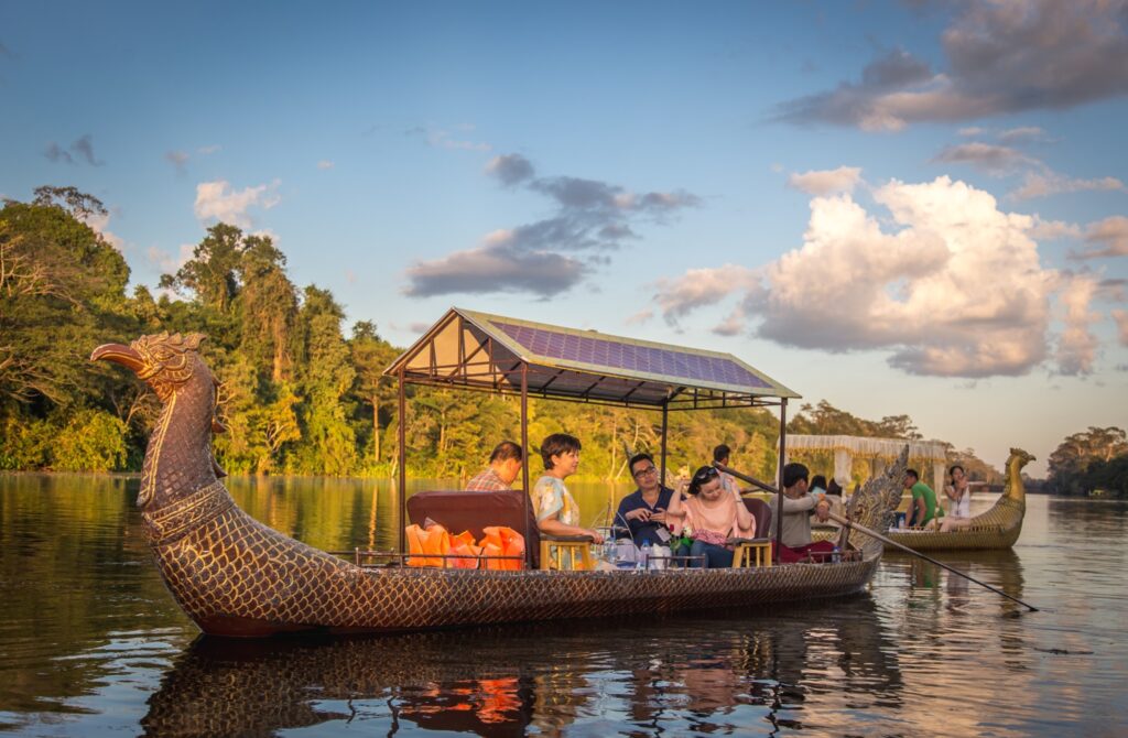 In the morning board a charming gondola boat riding along the serenity moat surrounding the Angkor Thom wall. The boat sails along the water way where history, nature and culture are created into ones. Overview of the scenic past and photograph along the great all of Angkor Thom, Royal Secret Path and City Guard Post.